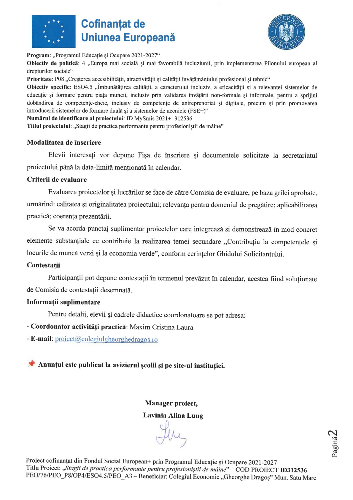 25 iunie 2025 - In Noutăți‚ Profesioniștii de mâine By Colegiului Economic ”Gheorghe Dragoș”, Satu Mare Comment off Anunt concurs Previous Concursul de proiecte destinat elevilor Next Avantajele unității scolare in proiectul: Stagii de practica performante pentru profesionistii de maine
