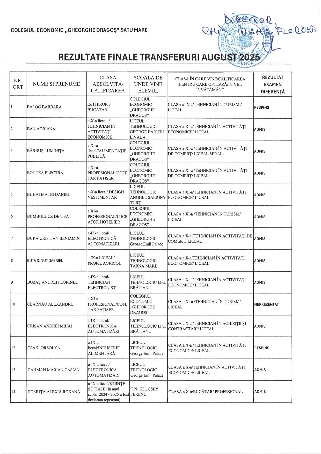 4 septembrie 2025 - In Diferențe‚ Noutăți By Colegiului Economic ”Gheorghe Dragoș”, Satu Mare Comment off REZULTATE FINALE TRANSFERURI AUGUST 2025 Previous Rezultate la examenul scris – Proba de admitere în învățământul seral Next ID312536 – Achiziție servicii medicina muncii, analize elevi.